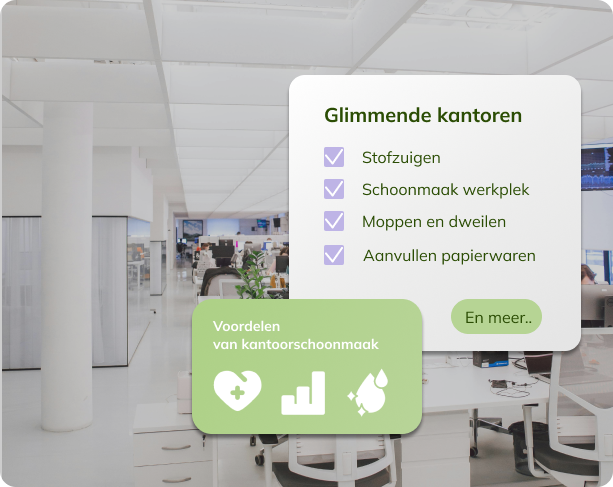 Laat ons uw kantoorruimte tot in de puntjes verzorgen voor een onberispelijke uitstraling. Nooit meer stress over schoonmaaktaken, wij zorgen voor een vlekkeloze werkplek zodat u zich kunt concentreren op uw core business.